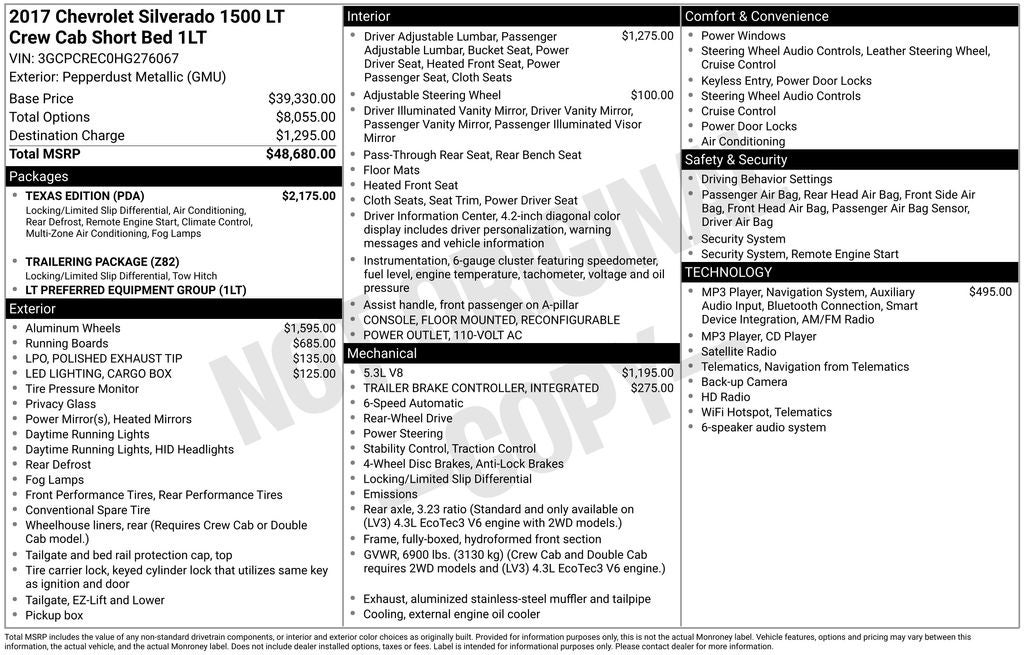 6-Speed Automatic Electronic with Overdrive, Cocoa/Dune Cloth, 110-Volt AC Power Outlet, 150 Amp Alternator, 4.2 Diagonal Color Display Driver Info Center, 6 Speaker Audio System, Bluetooth® For Phone, Body Color Bodyside Moldings, Body-Color Door Handles, Body-Color Mirror Caps, Body-Color Power Adjustable Heated Outside Mirrors, Chrome Grille Surround, Color-Keyed Carpeting w/Rubberized Vinyl Floor Mats, Deep-Tinted Glass, Driver & Front Passenger Illuminated Vanity Mirrors, Dual-Zone Automatic Climate Control, Electric Rear-Window Defogger, EZ Lift & Lower Tailgate, Front Chrome Bumper, HD Radio, Heavy-Duty Rear Locking Differential, Leather Wrapped Steering Wheel w/Cruise Controls, Manual Tilt Wheel Steering Column, OnStar 3 Months Guidance Plan, OnStar w/4G LTE, Power Windows w/Driver Express Up, Preferred Equipment Group 1LT, Rear 60/40 Folding Bench Seat (Folds Up), Rear Chrome Bumper, Rear Vision Camera, Rear Wheelhouse Liners, Remote Keyless Entry, Remote Locking Tailgate, Remote Vehicle Starter System, Single Slot CD/MP3 Player, Steering Wheel Audio Controls, Texas Edition, Texas Edition Badging, Theft Deterrent System (Unauthorized Entry), Thin Profile LED Fog Lamps, Trailering Package, Wheels: 20 x 9 Polished-Aluminum.