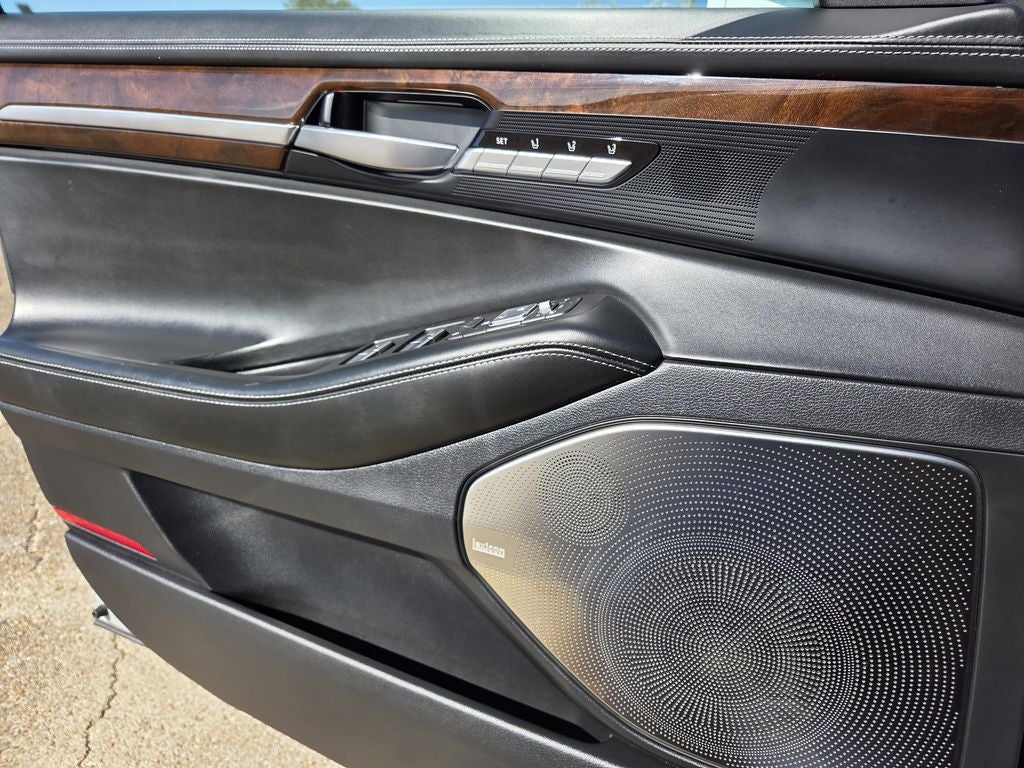 17 Speakers, 4-Wheel Disc Brakes, ABS brakes, Adaptive suspension, Air Conditioning, Alloy wheels, AM/FM radio: SiriusXM, Auto High-beam Headlights, Auto tilt-away steering wheel, Auto-dimming door mirrors, Auto-dimming Rear-View mirror, Auto-leveling suspension, Automatic temperature control, Bodyside moldings, Brake assist, Bumpers: body-color, Compass, Delay-off headlights, Door auto-latch, Driver door bin, Driver vanity mirror, Dual front impact airbags, Dual front side impact airbags, Electronic Stability Control, Emergency communication system: Genesis Connected Services, Exterior Parking Camera Rear, Four wheel independent suspension, Front anti-roll bar, Front Bucket Seats, Front Center Armrest, Front dual zone A/C, Front fog lights, Front reading lights, Fully automatic headlights, Garage door transmitter: HomeLink, Genuine wood dashboard insert, Genuine wood door panel insert, Head restraints memory, Heads-Up Display, Heated & Vented Front Bucket Seats w/Memory, Heated door mirrors, Heated front seats, Heated rear seats, Heated steering wheel, Illuminated entry, Knee airbag, Leather Shift Knob, Leather steering wheel, Low tire pressure warning, Memory seat, Nappa Leather Seating Surfaces, Navigation System, Occupant sensing airbag, Outside temperature display, Overhead airbag, Overhead console, Panic alarm, Passenger door bin, Passenger vanity mirror, Power adjustable front head restraints, Power door mirrors, Power driver seat, Power moonroof, Power passenger seat, Power steering, Power windows, Radio: AM/FM/HD/SiriusXM/CD/DVD Audio System, Rain sensing wipers, Rear air conditioning, Rear anti-roll bar, Rear reading lights, Rear seat center armrest, Rear side impact airbag, Rear Window Blind, Rear window defroster, Remote CD player, Remote keyless entry, Security system, Speed control, Speed-sensing steering, Speed-Sensitive Wipers, Steering wheel memory, Steering wheel mounted audio controls, Tachometer, Telescoping steering wheel, Tilt steering wheel, Traction control, Trip computer, Turn signal indicator mirrors, Variably intermittent wipers, Ventilated front seats, Wheels: 19 Chrome Alloy.