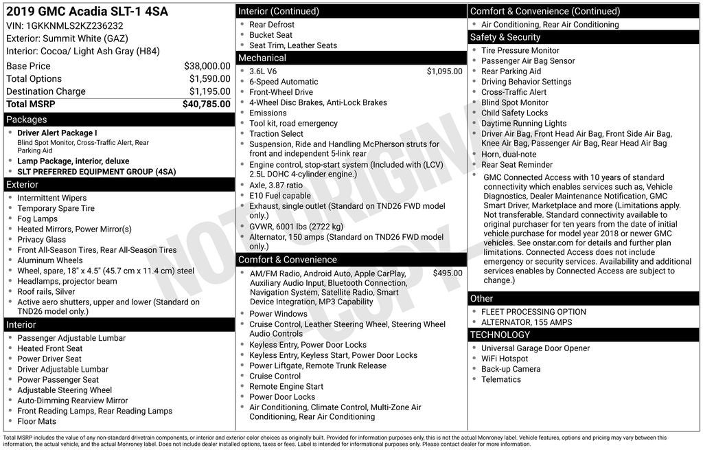 Summit White 2019 GMC Acadia SLT-1 4D Sport Utility FWD 6-Speed Automatic 3.6L V6 SIDI