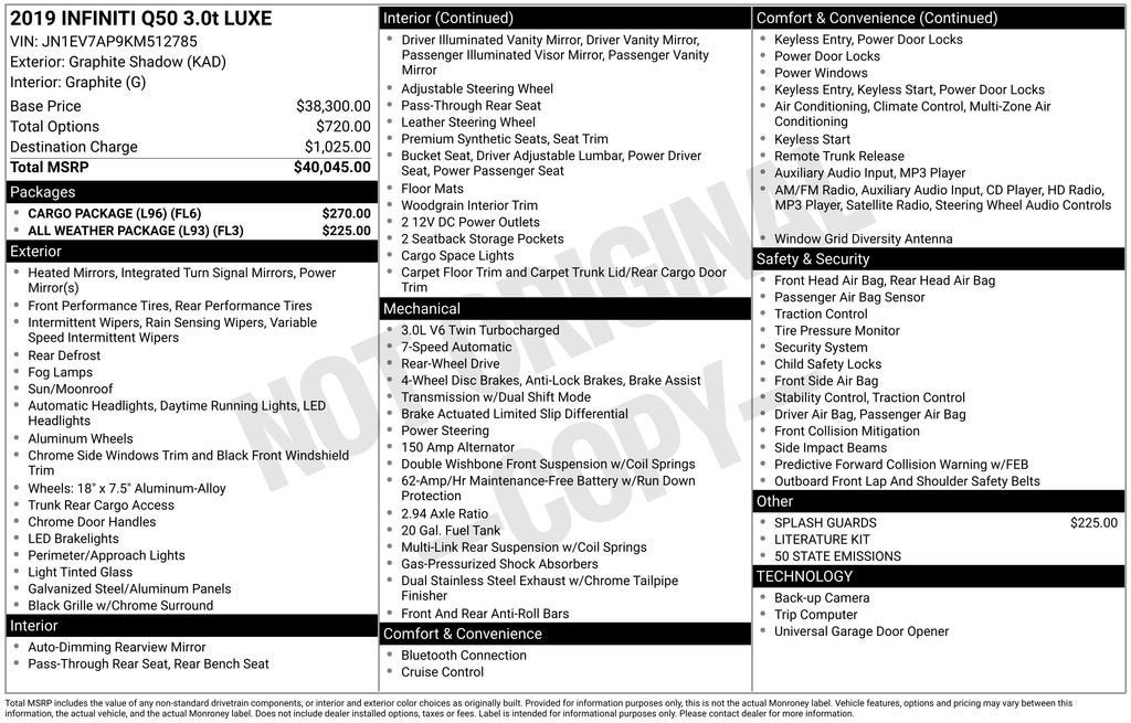 Discover the exceptional 2019 INFINITI Q50 3.0t LUXE, a sophisticated and dynamic sedan that blends style, performance, and cutting-edge technology. This captivating vehicle is the perfect combination of elegance and power, making it the ideal choice for the discerning driver.Elevate your driving experience with the impressive array of premium features that come standard with the Q50 3.0t LUXE. Indulge in the convenience of the Cargo Package, which includes a shopping bag hook, cargo net, first aid kit, and carpeted trunk mat, as well as the All Weather Package, providing you with all-season floor mats and a trunk protector to keep your vehicle protected in any conditions.• Cargo Package (L96)• All Weather Package (L93)• 6 Speakers• AM/FM radio: SiriusXM• CD player• Air Conditioning• Automatic temperature control• Front dual zone A/C• Power driver seat• Power steering• Power windows• Remote keyless entry• Steering wheel mounted audio controlsThe Q50 3.0t LUXE is powered by a robust 3.0L V6 engine, delivering an impressive balance of power and efficiency with its 7-speed automatic transmission and rear-wheel-drive configuration. Experience the thrill of commanding the road with the Q50's dynamic handling and responsive steering, all while enjoying a smooth and comfortable ride.Step inside the Q50 3.0t LUXE and immerse yourself in a world of refined luxury. The interior is adorned with genuine wood accents, a leather-wrapped steering wheel, and leatherette seating surfaces, creating an environment of sophistication and comfort. The power moonroof and advanced technology features, including the premium audio system and driver-centric infotainment, further enhance your driving experience.Safety is of the utmost importance, and the Q50 3.0t LUXE is engineered to provide you with peace of mind. Equipped with a suite of advanced safety features, including anti-lock brakes, electronic stability control, and a comprehensive airbag system, this vehicle is designed to protect you and your passengers in the event of an accident.Discover the exceptional craftsmanship, performance, and technology that make the 2019 INFINITI Q50 3.0t LUXE the ultimate luxury sedan. Experience the difference for yourself by scheduling a test drive at our showroom today. We're confident that once you get behind the wheel, you'll be captivated by the Q50's unparalleled driving dynamics and refined elegance.