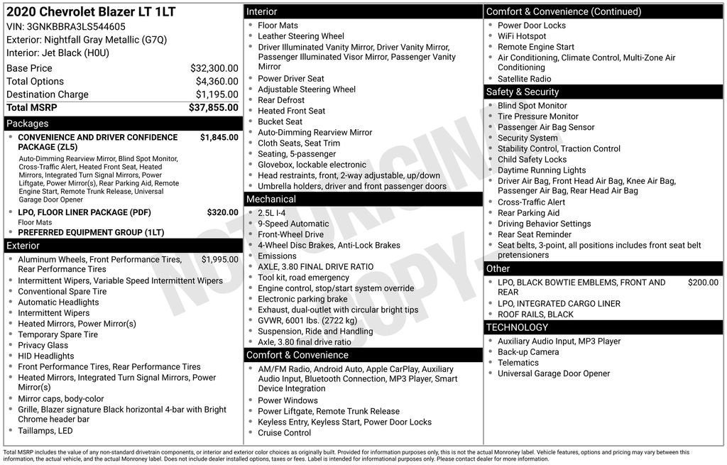 Discover the exceptional value of this 2020 Chevrolet Blazer LT, a remarkable SUV that combines style, performance, and cutting-edge technology. With its sleek gray exterior and well-appointed interior, this Blazer LT is the perfect blend of form and function, ready to elevate your driving experience.• Just Traded• 20 Gloss Black Aluminum Wheels• Convenience and Driver Confidence Package• Floor Liner Package• Black Bowtie EmblemsThis Blazer LT is equipped with a host of premium features that will enhance your daily commute and weekend adventures. Enjoy the convenience of remote start, the comfort of heated front seats, and the added security of lane change alert with side blind zone alert. The power programmable liftgate and universal home remote provide effortless access and control, while the auto-dimming rearview mirror and outside heated mirrors ensure optimal visibility.The 2.5L 4-cylinder engine and 9-speed automatic transmission deliver a smooth and efficient performance, with an impressive 21 city and 27 highway MPG. The four-wheel independent suspension and speed-sensing steering provide a responsive and engaging driving experience, while the four-wheel disc brakes with ABS ensure confident stopping power.Step inside and discover the well-appointed interior, featuring premium cloth seating, a leather-wrapped steering wheel, and a Chevrolet Infotainment 3 system with Apple CarPlay and Android Auto compatibility. The split-folding rear seat and ample cargo space make this Blazer LT the perfect companion for your active lifestyle, whether you're transporting family, friends, or gear.Safety is also a top priority, with features like dual front impact airbags, dual front side impact airbags, and a rear-view camera to help you navigate with confidence. The OnStar and Chevrolet connected services provide added peace of mind, ensuring you're always connected and protected.When You Purchase From Us, You Always Get More Value because That's the McLarty Way!Protect Your Vehicle Investment!Included with EVERY purchase you will receive:• Tire Repair/Replacement• Paintless Dent Repair• Windshield Repair• Key ReplacementAsk your Consultant for details! Gray Daniels Chevrolet in Jackson, MS is proudly owned and operated by McLarty Automotive.