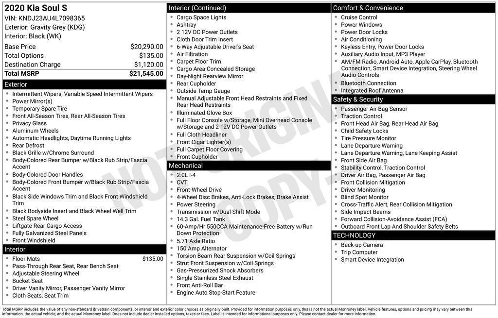 Boasting a sleek, modern exterior and a well-appointed interior, the 2020 Kia Soul S offers an array of premium features that will impress even the most discerning driver. Enjoy the convenience of -