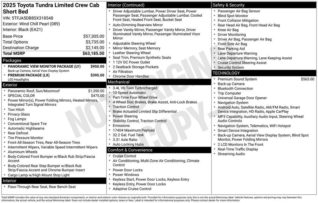 Step into full-size truck capability with this Pre-Owned 2025 Toyota Tundra Limited CrewMax, finished in striking Wind Chill Pearl with a refined Black interior.